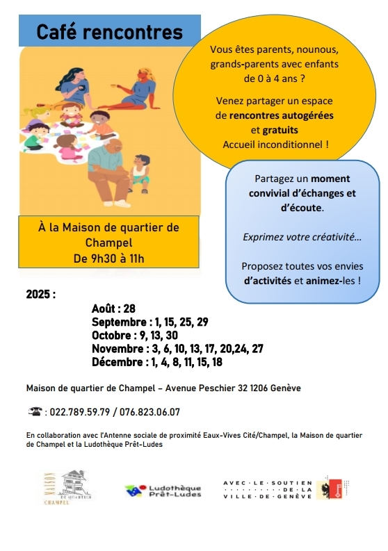 Café-rencontres Pour les adultes accompagnants des enfants âgés de 0 à 4 ans ! Des rencontres autogérées libres et gratuites, les lundis et/ou jeudis de 9h30 à 11h.